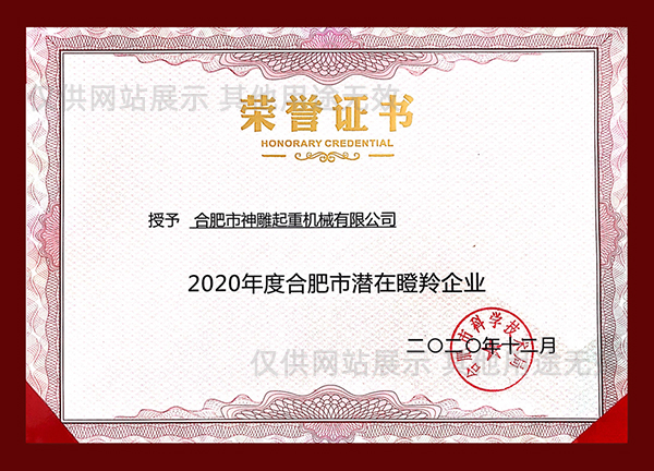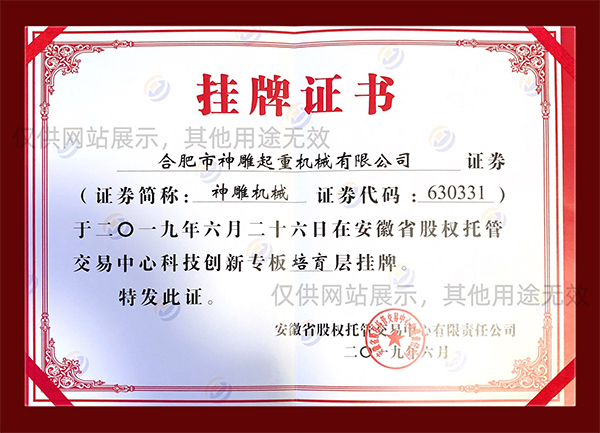 合肥神雕起重是高新技術(shù)企業(yè),是安徽省科創(chuàng)板掛牌企業(yè)(證券代碼:630331),同時(shí)榮獲安徽市場(chǎng)質(zhì)量、誠(chéng)信五星級(jí)企業(yè)、合肥經(jīng)濟(jì)圈示范企業(yè)、合肥市創(chuàng)新型企業(yè)、安徽省市場(chǎng)質(zhì)量放心產(chǎn)品等榮譽(yù)稱號(hào)